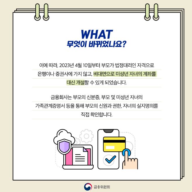 2023년 4월 10일부터 부모가 법정대리인으로 은행이나 증권사에 가지 않고 비대면으로 미성년 자녀의 계좌를 대신 개설할 수 있게 되었습니다!