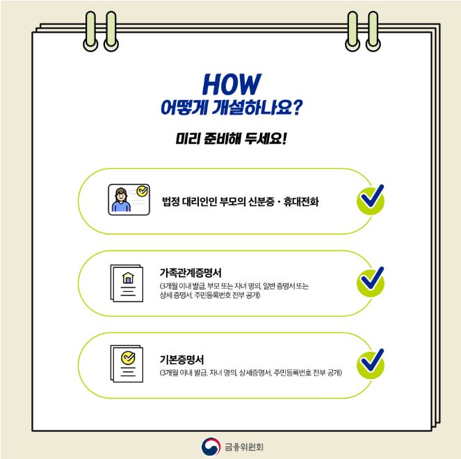 금융회사는 부모의 신분증, 부모 및 미성년 자녀의 가족관계증명서 등을 통해 부모의 신원과 권한, 자녀의 실지명의를 직접 확인합니다.