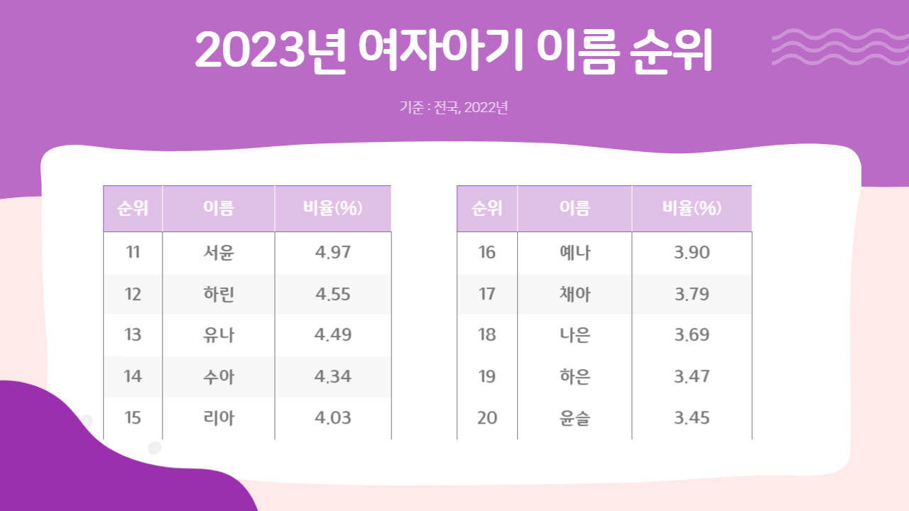 몇년전까지만 해도 서윤과 하은이 독보적인 1위, 2위를 다퉜는데 몇 년새에 서윤의 순위가 많이 밀렸네요