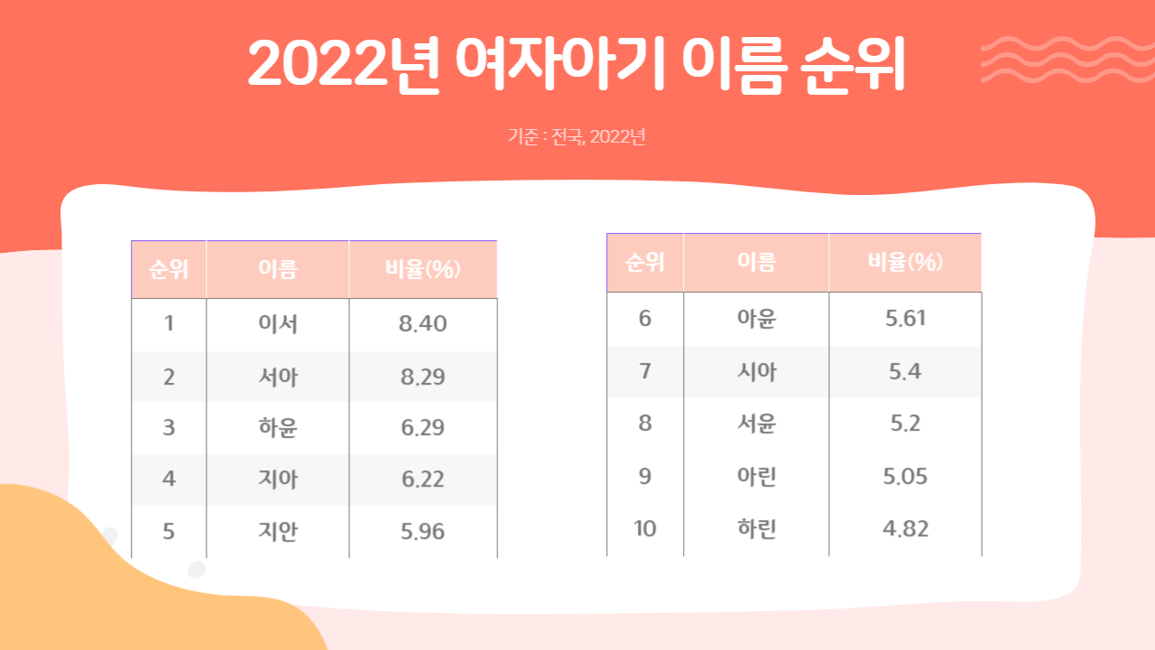 2022년과 2023년(2023년 3월기준) 여자아기와 남자아기이 이름 순위를 소개합니다. 곧 태어날 아기의 이름을 지으려는 분들에게 도움이 되는 정보입니다.