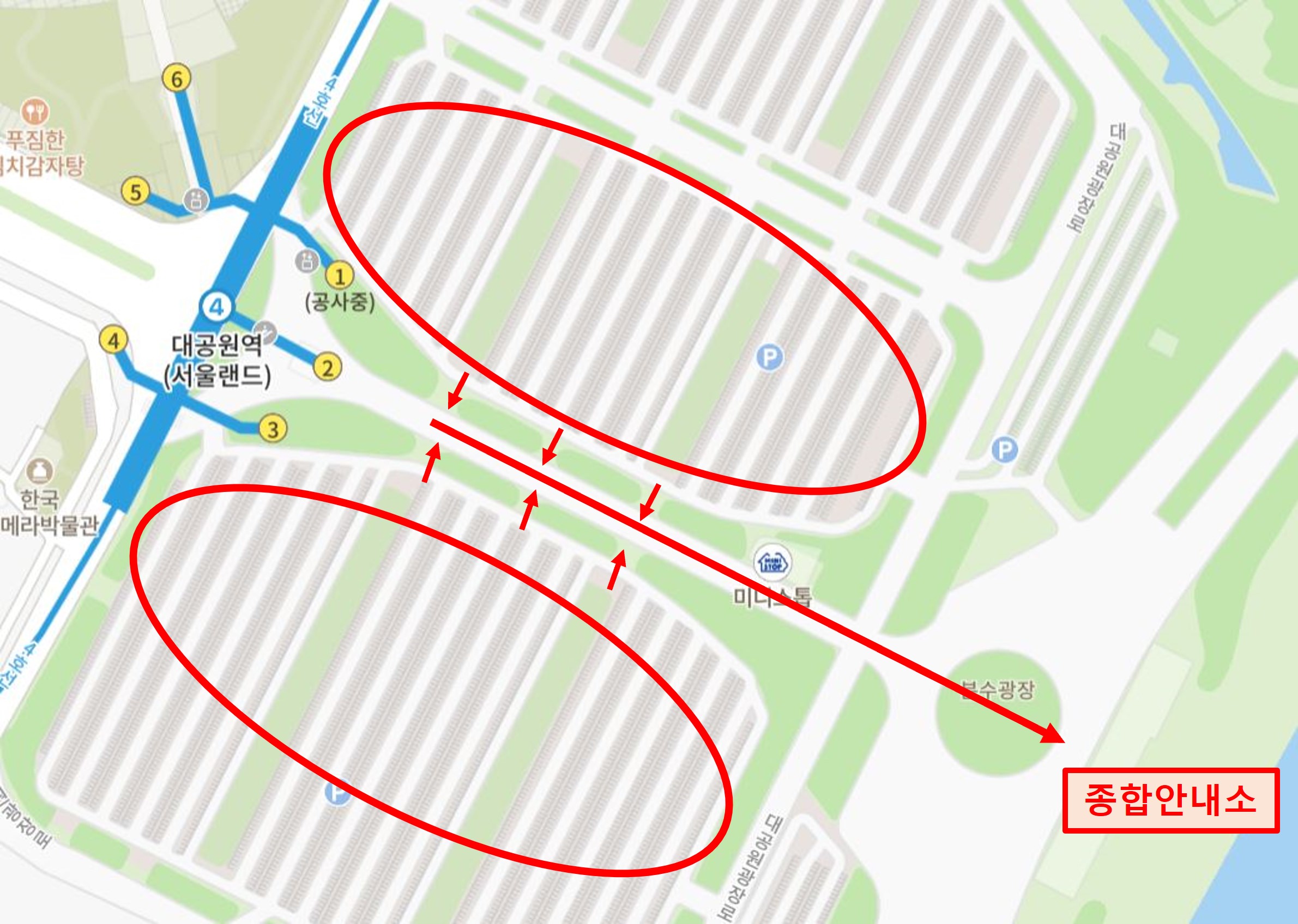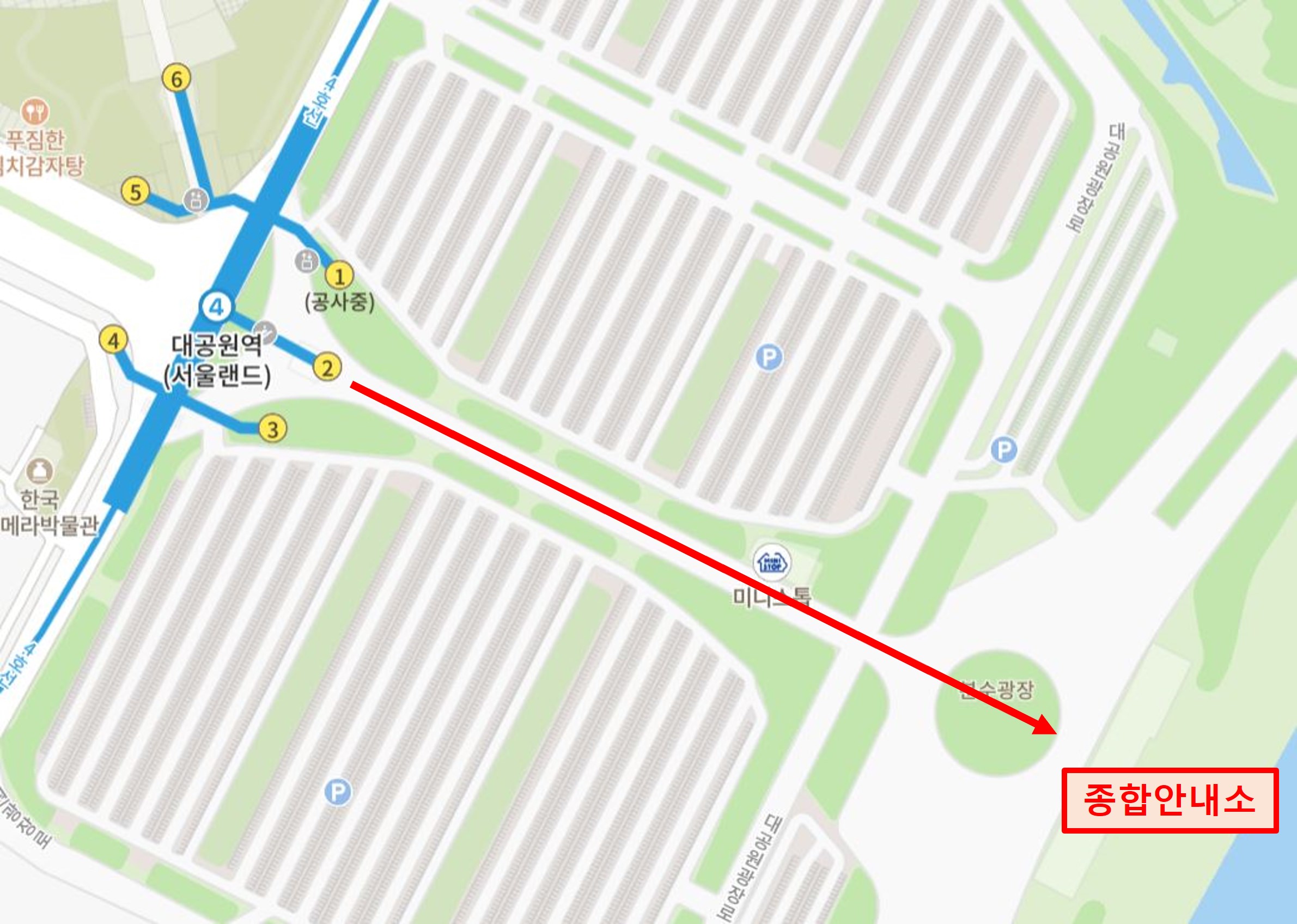 지하철 4호선 대공원역 1,2,3번 출구로 나와서 앞으로 쭉 걸어가면 동그란 분수광장이 나오고 그 앞에 종합안내소가 있습니다