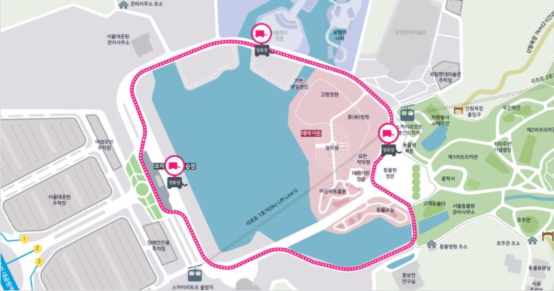 * 제1정류장에서는 서울동물원, 식물원, 산림욕장, 테마가든, 장미원, 어린이 동물원, 국립현대미술관, 서울대공원 캠핑장에 갈 수 있어요