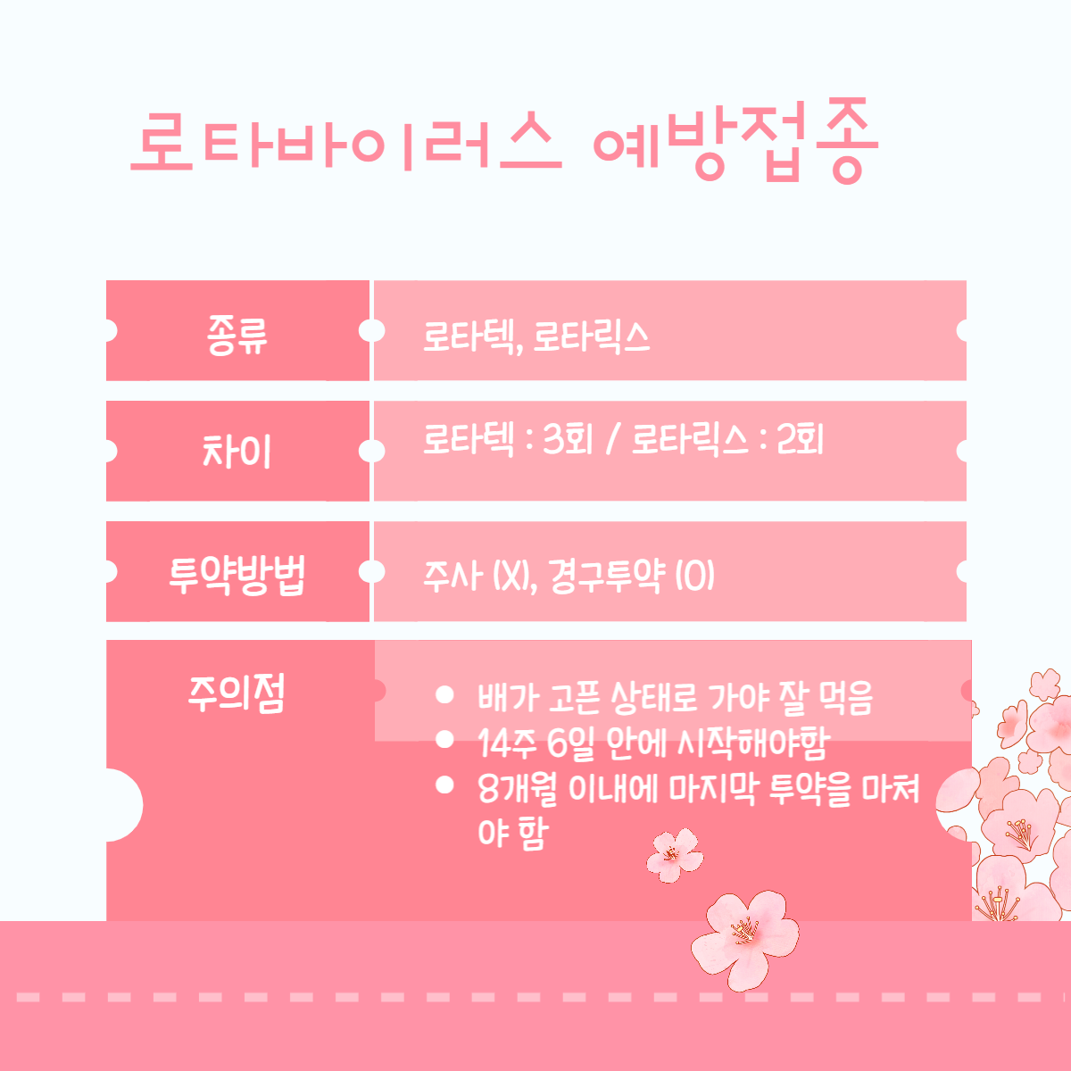 14주 6일이 지나면 로타바이러스 접종을 할 수 없으므로 2개월 접종할 때 같이 접종을 시작하도록 합니다. 예방접종을 하다보면 접종일이 조금씩 밀리기도 하는데 늦어도 생후 8개월 이내에 마지막 접종을 마쳐야 합니다.
