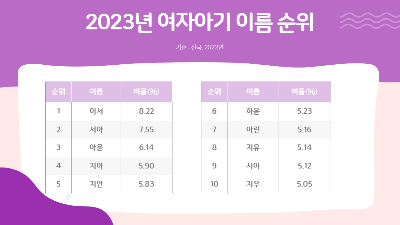 2022년과 2023년(2023년 3월기준) 여자아기와 남자아기이 이름 순위를 소개합니다. 곧 태어날 아기의 이름을 지으려는 분들에게 도움이 되는 정보입니다.